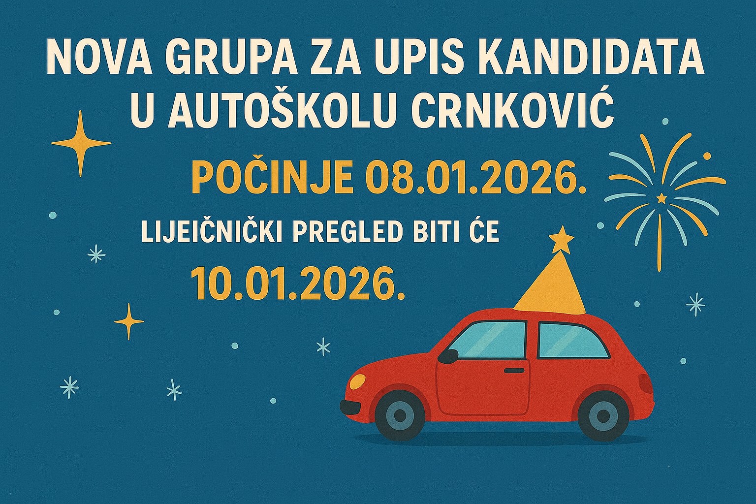 Upise možete obaviti u AUTOŠKOLI «CRNKOVIĆ» svakim danom od 8:00–15:30 sati, te subotom od 9–11 sati.