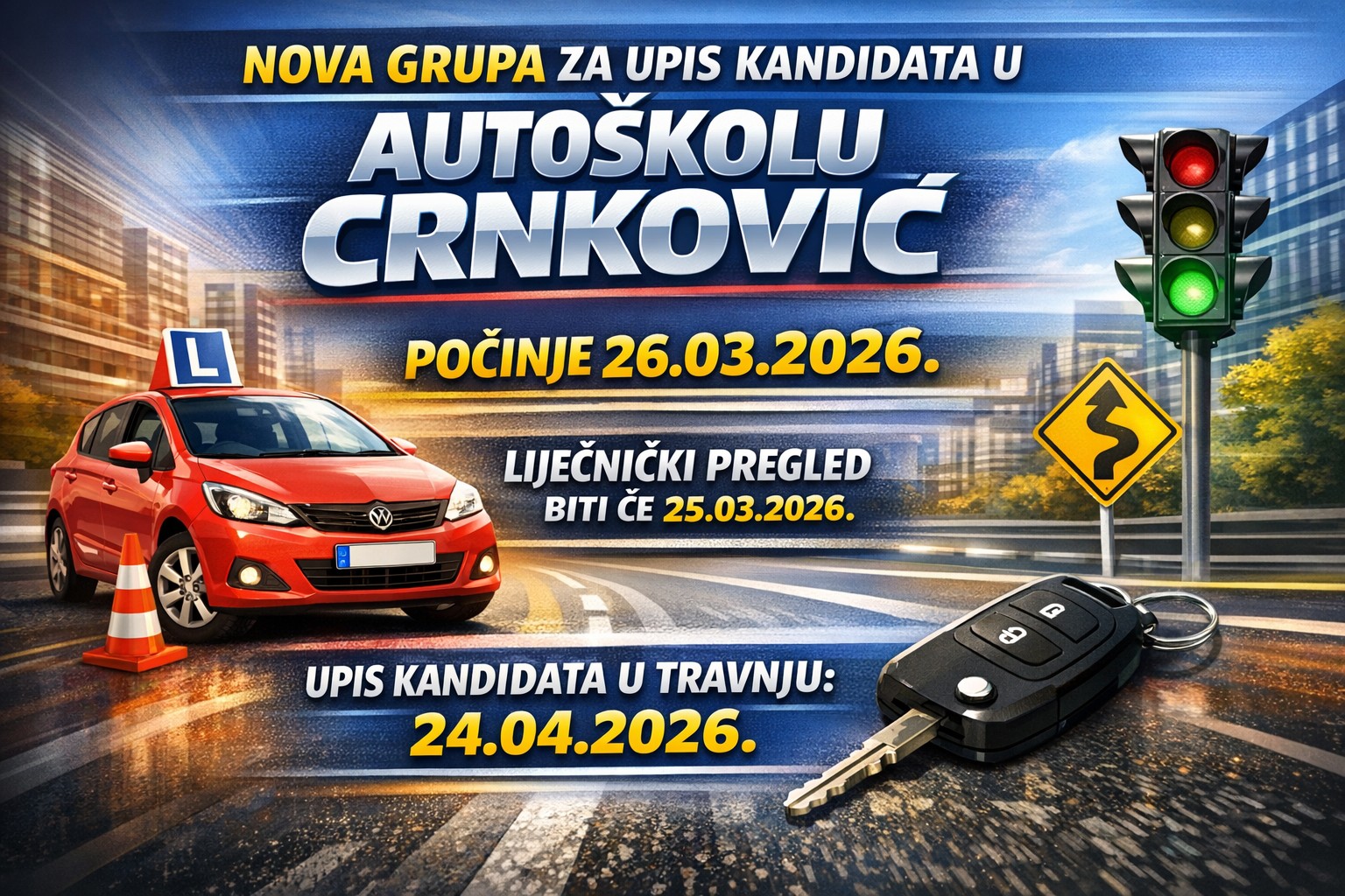 Naša stručna ekipa instruktora posvećena je tome da Vas pripremi za sigurnu vožnju i za život na cesti, a nova vozila samo su još jedan važan korak ka tome. Ako želite započeti svoje vozačko putovanje, sada je pravo vrijeme! U tijeku su uspisi u novu grupu.
